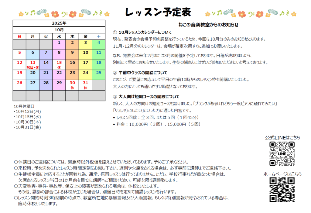 レッスン予定表(2025年10月分)を公開しました。(教室からのお知らせ付き)