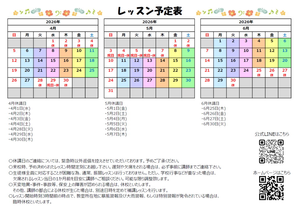 レッスン予定表(2026年4月~6月分)を公開しました。